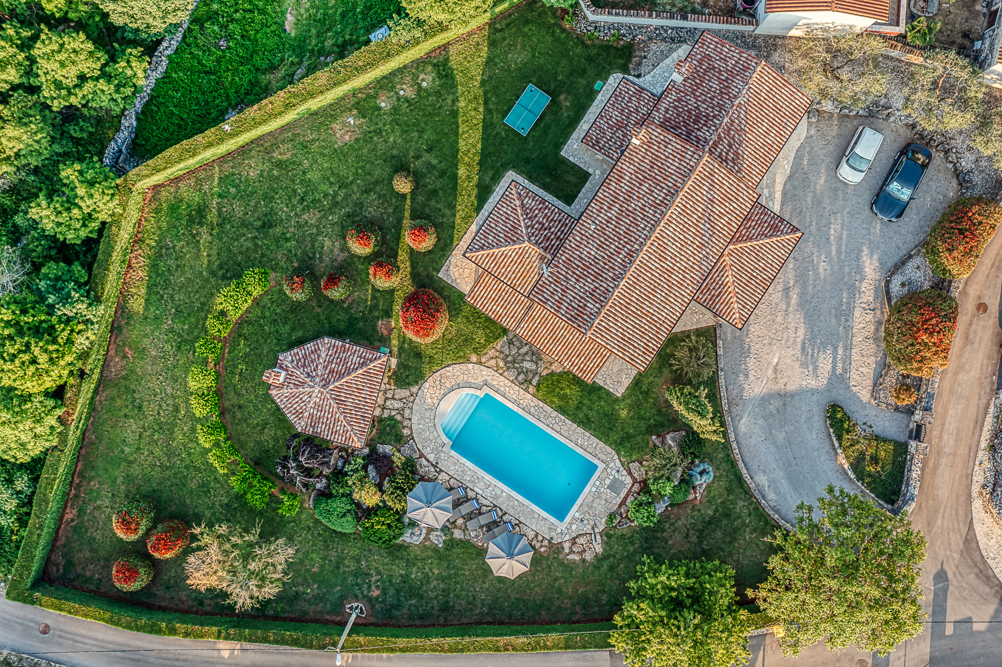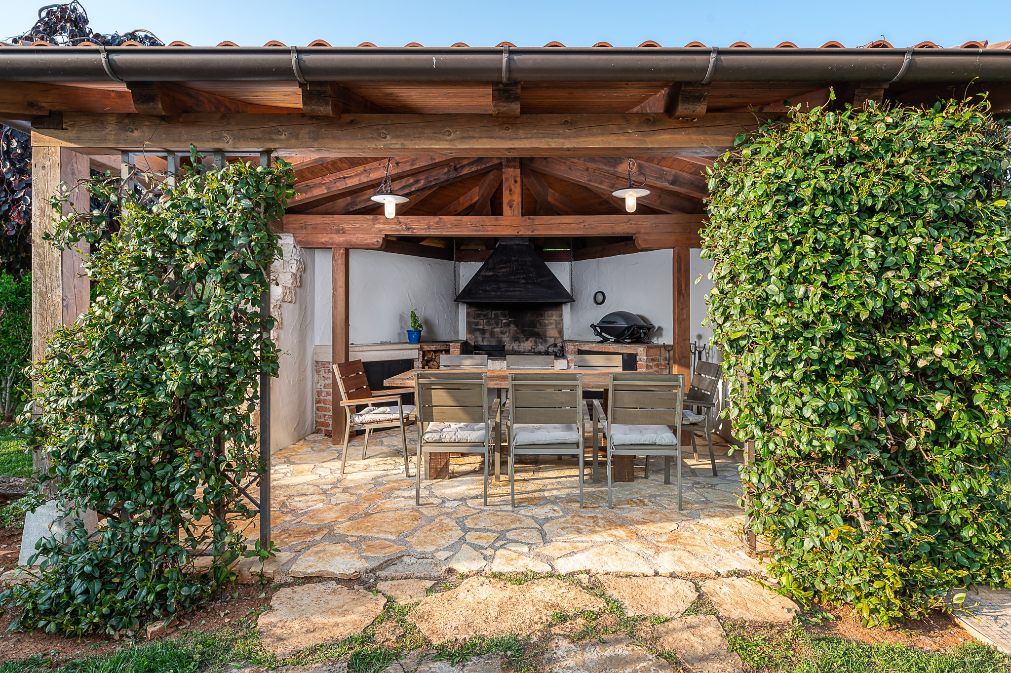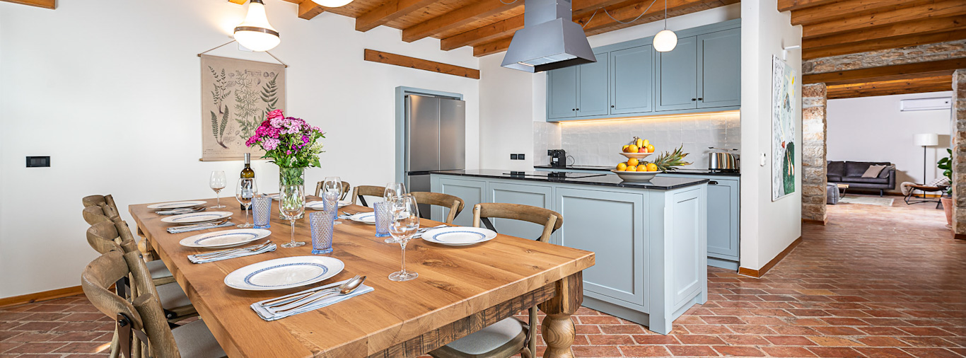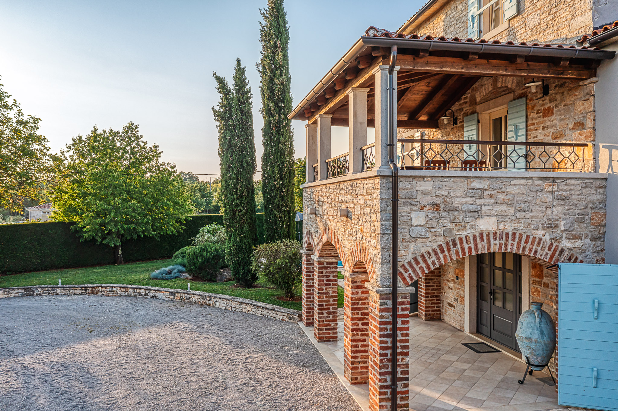 Večeri možete provesti i na jednoj od terasa kuće s kojih se pruža predivan pogled na zalazak sunca i pitom krajobraz ili ispod sjenice, uživajući u domaćem vinu i roštilju. Pažljivo uređeni vrtovi, velike travnate površine, mnoštvo lavande i ružmarina učiniti će svaki provedeni dan ovdje posebnim. Najmlađi će se veseliti igri na toboganu ili klackalici, igrajući badminton ili nogomet, možda igraćoj konzoli, ali zasigurno će najviše vremena provesti kupajući se u bazenu.